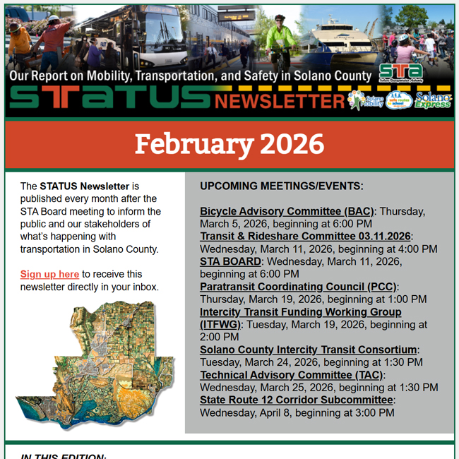 The STATUS Newsletter is published every month after the STA Board meeting to inform the public and our stakeholders of what’s happening with transportation in Solano County. Click the link HERE to view the February 2026 STATUS Newsletter.