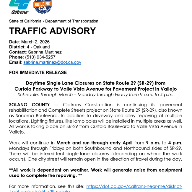SOLANO COUNTY – Caltrans Construction is continuing its pavement rehabilitation and Complete Streets project on State Route 29 (SR-29), also known as Sonoma Boulevard. In addition to driveway and alley repaving at multiple locations. Lighting fixtures, like lamp poles will be installed in multiple areas as well. All work is taking place on SR-29 from Curtola Boulevard to Valle Vista Avenue in Vallejo.