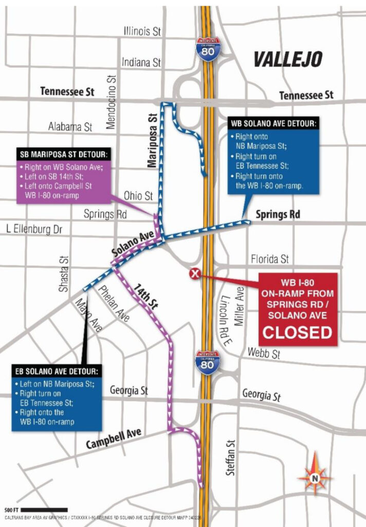 SOLANO COUNTY – Caltrans Construction continues to upgrade lighting around Solano County. To ensure worker and public safety, a full closure is scheduled of the Solano Avenue/Spring Road On-Ramp to Westbound (WB) i-80 in Vallejo starting on Friday, May 1, 2026 at 07:00 PM and opening on Monday, May 4, 2026 at 05:00 AM. Caltrans will be constructing curb ramps and installing new traffic signals at the intersection of Solano Avenue/Springs Road and the WB I-80 On-Ramp.