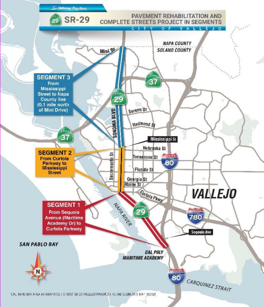 SOLANO COUNTY – Caltrans is continuing its pavement rehabilitation and complete street work on State Route 29, also known as Sonoma Blvd. The coming weeks will have multiple locations working on the deconstruction and repaving of various driveways and curb ramps.