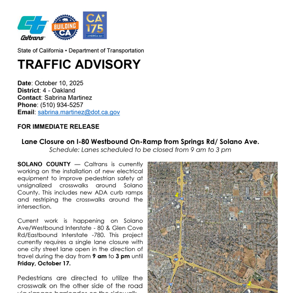 Current work is happening on Solano Ave/Westbound Interstate – 80 & Glen Cove Rd/Eastbound Interstate -780. This project currently requires a single lane closure with one city street lane open in the direction of travel during the day from 9 am to 3 pm until Friday, October 17.