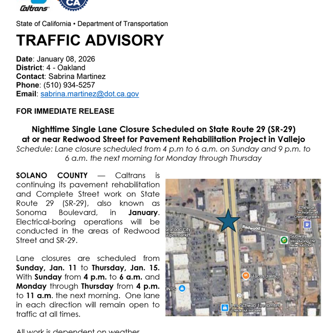 Date: January 08, 2026 Agency: 4 - Oakland Contact: Sabrina Martinez Phone: (510) 934-5257 Email: sabrina.martinez@dot.ca.gov Nighttime Single Lane Closure Scheduled on State Route 29 (SR-29) at or near Redwood Street for Pavement Rehabilitation Project in Vallejo Schedule: Lane…
