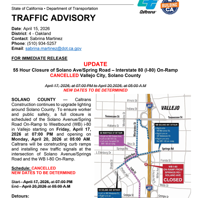 Date: April 14th, 2023 District: District 4 Contact: Hector Chinchilla Phone: (510) 421-8040 FOR IMMEDIATE RELEASE Lane & Ramp Closures on I-80 Travis Blvd and Air Base Parkway exits in Fairfield, Solano County. Ramp closures will occur overnight…