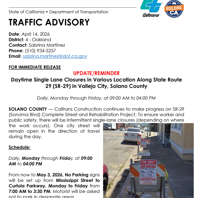 Date: December 12, 2025 District: 4 - Oakland Contact: Sabrina Martinez Phone: (510) 934-5257 Email: sabrina.martinez@dot.ca.gov Daytime Single Lane Closure on State Route-29 from Curtola Parkway to Valley Vista Ave.(PM 1.92 /3.49) Schedule: Lane Closure from 9 AM to 4…