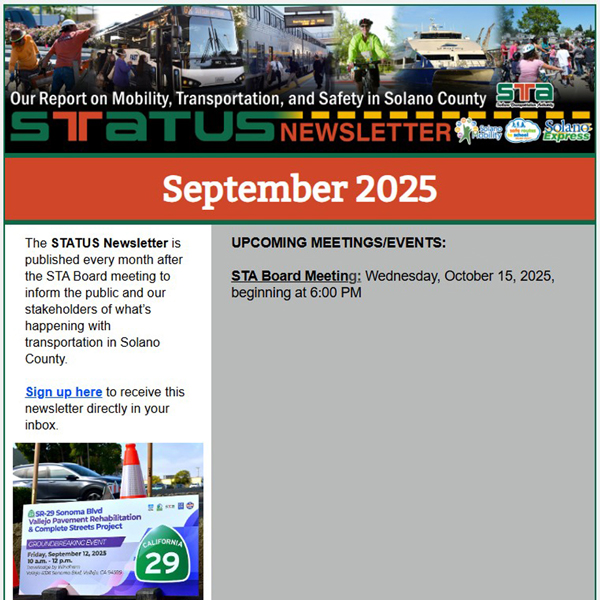 The STATUS Newsletter is published every month after the STA Board meeting to inform the public and our stakeholders of what’s happening with transportation in Solano County.