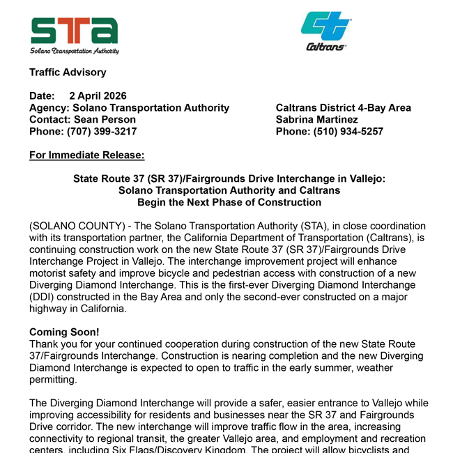Date: 2 April 2026 Agency: Solano Transportation Authority, Caltrans District 4-Bay Area Contact: Sean Person, Sabrina Martinez Phone: (707) 399-3217, Phone: (510) 934-5257 State Route 37 (SR 37)/Fairgrounds Drive Interchange in Vallejo: Solano Transportation Authority and Caltrans Begin the…