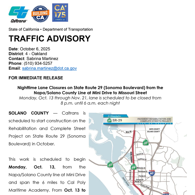 Date: October 6, 2025 District: 4 Contact: Sabrina Martinez Phone: (510) 934-5257 Email: sabrina.martinez@dot.ca.gov Nighttime Lane Closures on State Route 29 (Sonoma Boulevard) from the Napa/Solano County Line at Mini Drive to Missouri Street Monday, Oct. 13 through Nov. 21,…