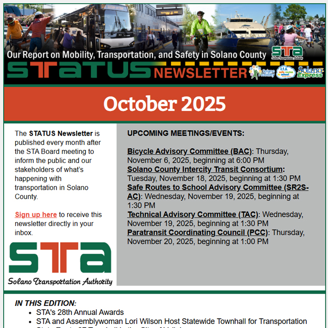 The STATUS Newsletter is published every month after the STA Board meeting to inform the public and our stakeholders of what’s happening with transportation in Solano County.